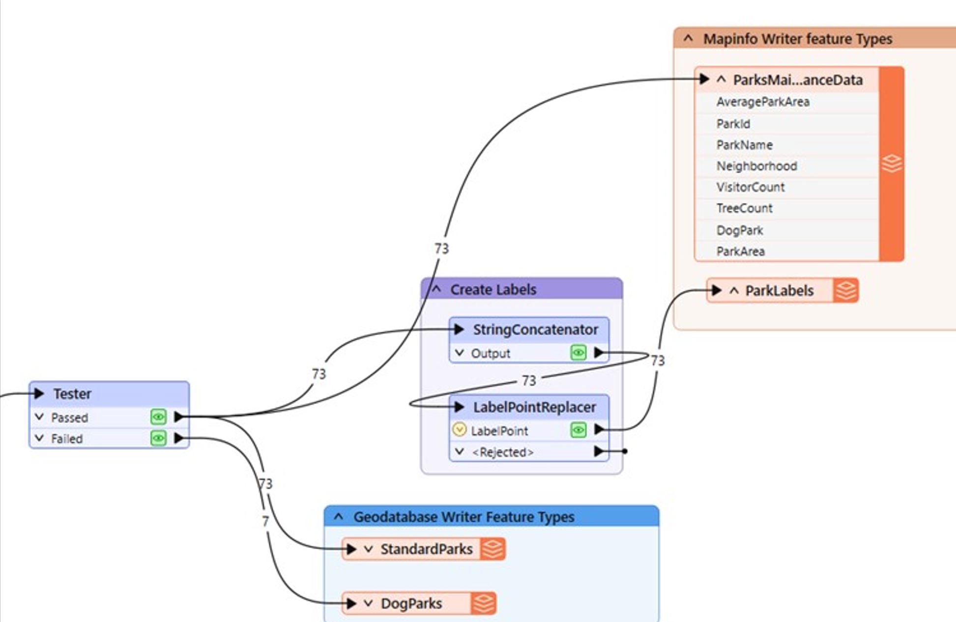 Make sure that you move the connections for the existing MapInfo Feature Types (ParksMaintenanceData and ParkLabels) to the ‘Passed’ port of the now moved Tester, as these do not need the Dog Parks.