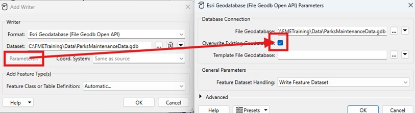 Click on the “Parameters…” button to open up the Writer Parameters. Tick the “Overwrite Existing Geodatabase” tickbox: