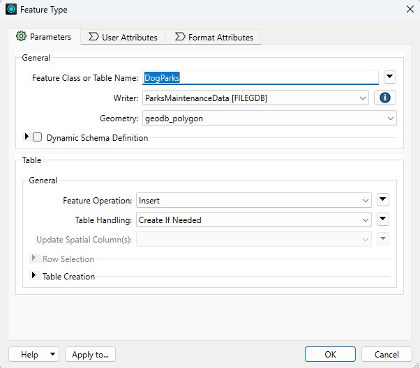 You will be prompted by the same Feature Type window that you saw when you created the Geodatabase Writer. Set the Feature Class name to be *DogParks*, and set the geometry as *geodb\_polygon*, as shown below: