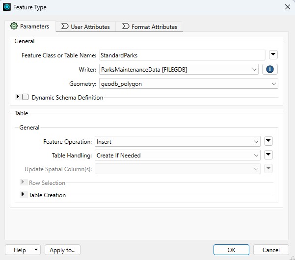 <table><thead><tr><th width="176">Parameter</th><th>Value</th></tr></thead><tbody><tr><td><strong>Writer Format</strong></td><td>Esri Geodatabase (File Geodb Open API)</td></tr><tr><td><strong>Writer Dataset</strong></td><td>C:\FMETraining\Output\ParksMaintenanceData.gdb</td></tr><tr><td><strong>Feature Class Definition</strong></td><td>Automatic…</td></tr></tbody></table>