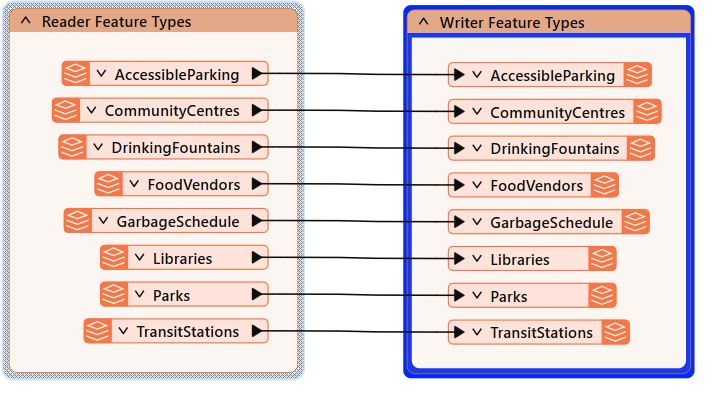A new workspace reads from left to right, from the source (Reader) feature types, through to the destination (Writer) feature types. Arrows denote the direction of data flow: